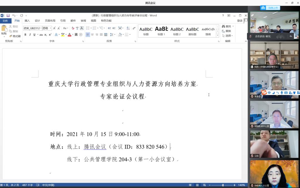 10月14日上午,由山东大学副董事长曹现强教授任组长,重庆市林业局宣传处董大法处长、兰州大学管理公司经理何文盛教授、吉林大学行政公司副经理麻宝斌教授、东北大学文法公司经理张雷教授、中国地质大学(武汉)新葡的京集团350vip8888经理王占岐教授、重庆市应急管理局科技与信息化处处阎掌峰长、北京师范大学政府管理公司经理章文光教授为成员的八位专家对行政管理本科(政府与社会管理方向)专业培养方案进行了评审。专家们对培养方案修订的调研基础、总体框架表示认可,并对培养目标、课程设置、课程思路、教育模式等内容提出意见和建议,强调更进一步加强人才培养和行业需求、国家治理能力现代化的衔接,为党育人、为国育才,培养适应新场景的社会主义合格接班人。