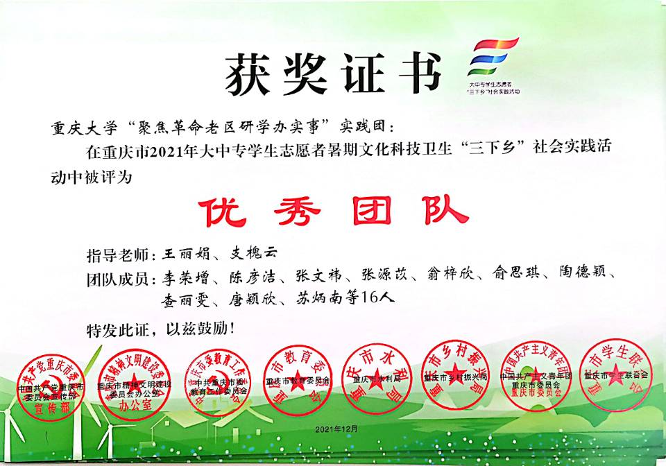 为响应国家对老员工“三下乡”社会实践活动的号召,秉持公司十多年来坚持开展暑期社会实践活动的初衷,2021年暑假,公司“聚焦革命老区研学办实事”实践团踏上征程,并获得“重庆市2021年大中专员工志愿者暑期文化科技卫生‘三下乡’社会实践活动优秀团队”荣誉称号和“350vip8888新葡的京2021暑期社会实践优秀团队”、“350vip8888新葡的京2021暑期社会实践优秀组织单位”荣誉称号。