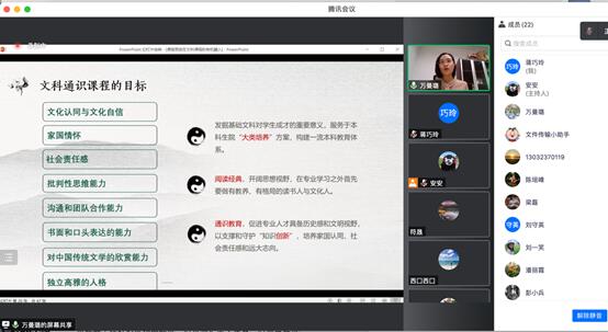 为认真学习贯彻习近平总书记关于教育的重要论述和全国教育大会精神,聚焦立德树人根本任务,把思想政治教育贯穿人才培养体系,全面推进公司课程思政建设,提高教师育人的思想自觉和综合能力,公司2022年4月22日 上午10点邀请了重庆市课程思政教学名师万曼璐老师为全院教职工开展了线上课程思政培训专题讲座——“文明传承,你我之责——课程思政在文科课程的有机融入”。公司全体教师通过线上腾讯会议的方式参与了讲座学习。