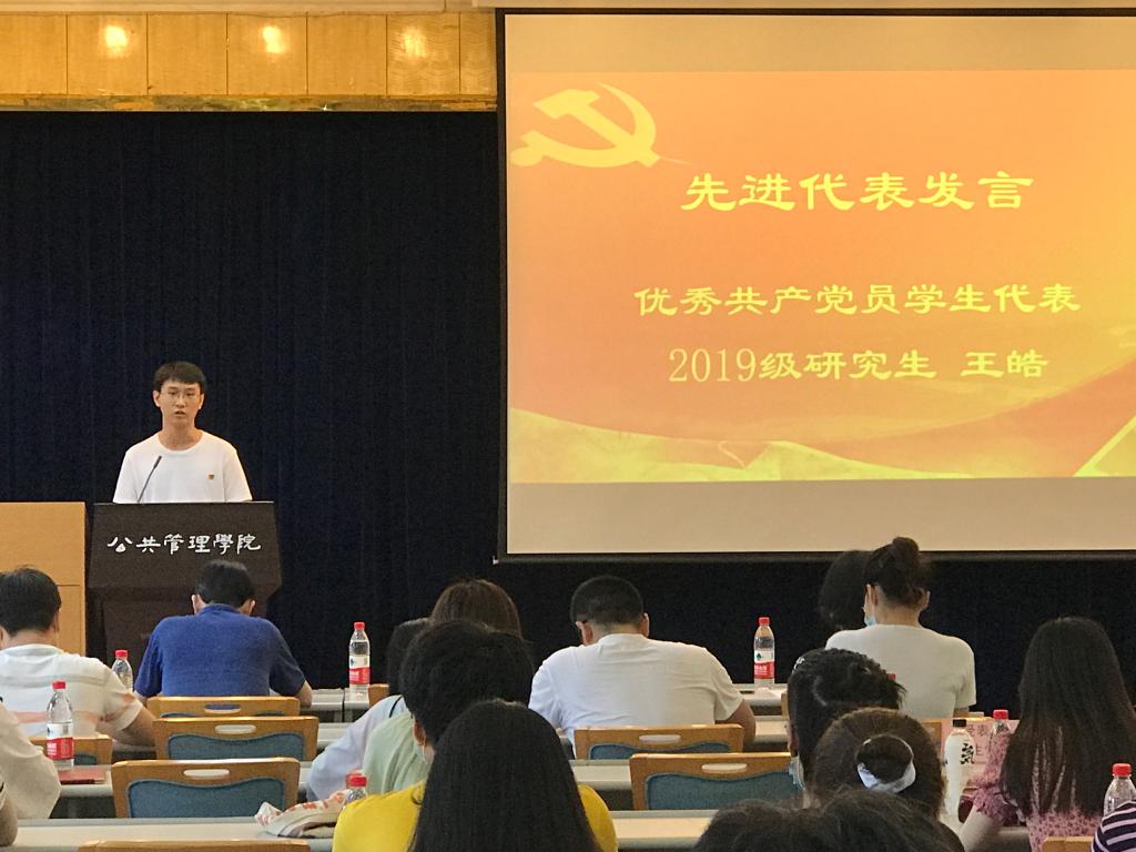 2019级硕士研究生王皓作为优秀共产党员员工代表发言,他表示,尤其是在今年,新冠疫情爆发以来,无数的党员同志,不忘党员身份,坚守岗位。作为员工党员,最直接、最有效的方法就是严格要求自己,向优秀的党员同志看齐,时刻保持自己的先进性,谦虚谨慎,立足本职,主动思考,勤奋刻苦学习。