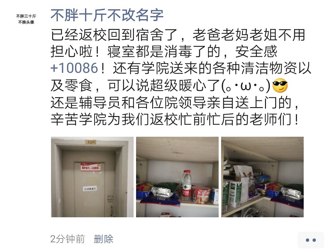 28日和29日下午,张玲书记、刘炳胜经理带队先后走访A区和虎溪校区员工宿舍,将公司准备的牛奶、水果、零食等慰问物资一一送到返校员工手中。在员工返校之前,公司已经将酒精、消毒液以及各种方便食品组成的“爱心包”准备好放在宿舍中,员工到达宿舍的第一时间即可领取。有的宿舍由于长时间无人居住、卫生状况堪忧,公司分管领导和辅导员从下午到凌晨,全力协调解决,确保全体员工顺利入住。一名返校同学说:“从到重庆一下车,到现在宿舍安顿好,时刻感受到公司、公司和老师们的关心关怀,真的很暖心!”