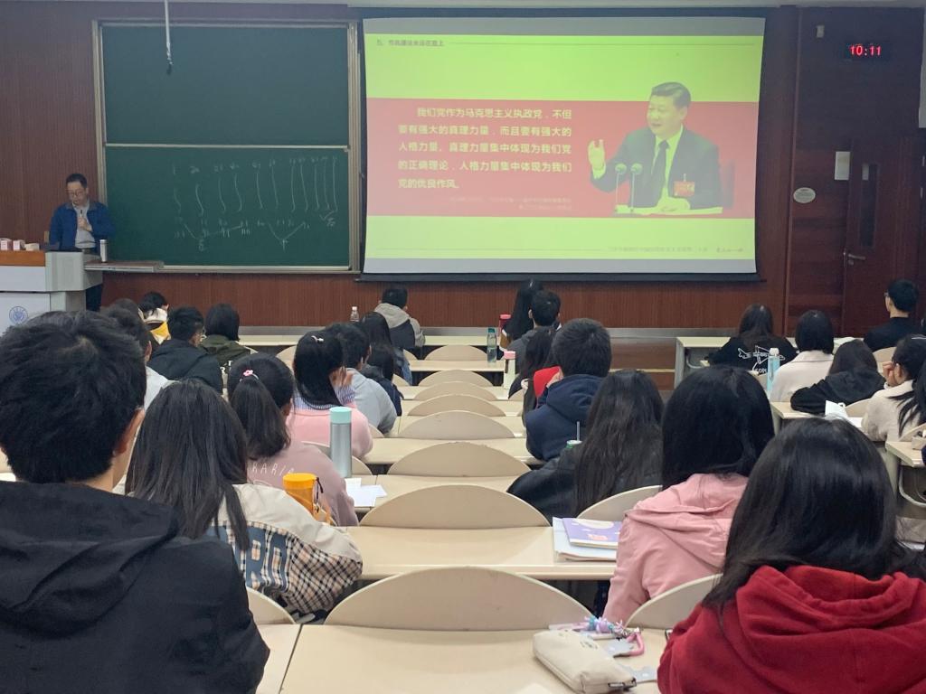 11月10日上午,马克思主义公司马克思主义基本原理教研室副主任蒋楼老师在虎溪校区D1134教室,给入党积极分子讲党课。蒋楼以“毫不动摇把党建设的坚强有力”为题,从“勇于自我革命是党最鲜明品格、党的政治建设是党的根本性建设、把思想建设作为党的基础性建设、建设高素质专业化干部队伍、作风建设永远在路上、用铁的纪律管党治党、不断扎牢制度笼子、夺取反腐败斗争压倒性胜利”等八个方面出发,有针对性地回答了如何理解勇于自我革命是中国共产党最鲜明的品格,为什么说政治建设是党的根本性建设,为什么说思想建设是党的基础性建设,为什么说作风建设永远在路上等新时代党的建设的几个重大理论与现实问题。