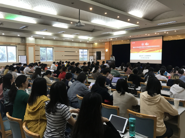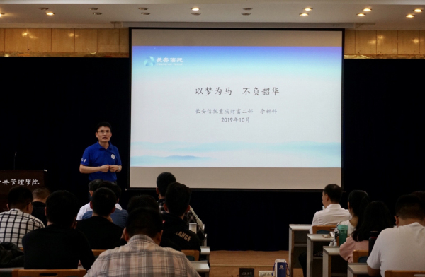 首先发言的是公司1995级国际经济学本科、1999级产业经济学硕士,现任长安国际信托重庆财富二部负责人的李新科员工。他结合自身工作经验,讲述了20年来我国经济社会“形势大不同”的具体表现。他认为,中国经济正进入新常态,市场出清、金融去杠杆正在逐步实现。他强调了“智慧”“态度”与“选择”在当今就业市场的重要性,建议同学们在夯实专业知识的同时,一定要保持良好心态应对各种挑战。李新科员工深入浅出的演讲为同学们带来了不一样的视野,赢得现场热烈掌声。