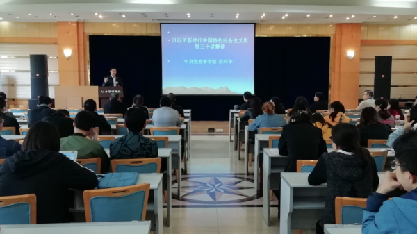 2019年3月29日上午,中央党校督学洪向华教授受邀到新葡的京集团350vip8888“公管讲坛”作专题报告,报告就《习近平新时代中国特色社会主义思想三十讲》进行解读。委书记张邦辉教授主持本次讲坛,公司领导班子成员、部分教师和各年级本科生、研究生共100余人参加讲坛。