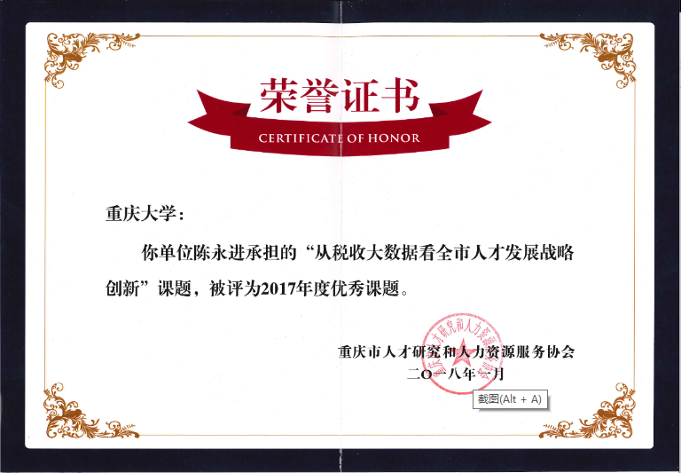 2018年1月18日,重庆市人才研究和人力资源服务协会年会暨第一届第二次会员代表大会在重庆市阳光五洲大酒店附楼主宴会厅举行。在年会颁奖环节中,公司陈永进教授承担的“从税收大数据看全市人才发展战略创新”课题,被评为2017年度优秀课题。