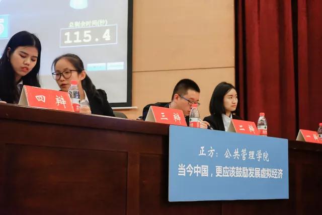 接下来的自由辩论环节更是掀起了本场比赛的高潮,我方三辩李欣同学用京东的发展等案例论证了虚拟经济的发展是我国经济发展必不可少的内容,正是因为虚拟经济的飞速发展存在一定的问题,当今中国才更应该鼓励虚拟经济健康协调发展,良好发挥虚拟经济的作用。反方则趁势攻击,虚拟经济利润率高出实体经济几倍之多,有引发金融危机的风险,而我国实体制造业却难以向高端制造跨越,因此更应该鼓励实体经济的发展。在自由辩论环节中,双方互不相让,紧紧抓住对方的逻辑漏洞逐一回击,同时引经据典、据理力争,不断用数据和案例事实论证己方观点。双方辩手精神饱满,思维缜密,精彩的发言深深地感染着现场的每一位观众。在最后的总结陈词环节中,双方四辩再次论证了己方的观点,并抓住对方的问题进行回击,为赢得比赛的胜利做最后的努力。双方发言完毕后,台下掌声经久不息。