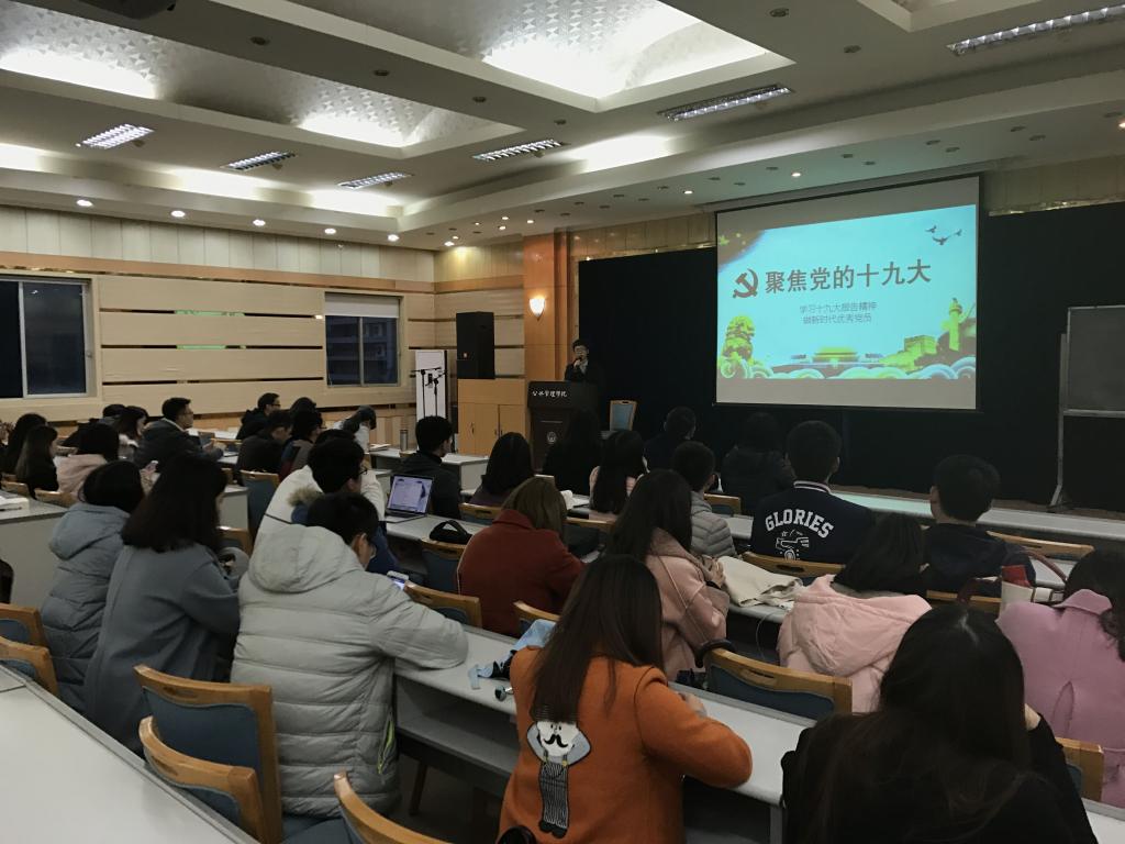 然后,他从十九大精神出发,阐述了我们作为新时代的青年所肩负的责任与担当。他认为我们应该时刻以习近平总书记为榜样,认清“我们的征途是星辰大海,要找到自己的瓦尔登湖”,当今世界,中国作为一支不可忽视的政治力量,正在迅速崛起,总书记在十九大上也提到“青年兴则国兴,青年强则国强”,我们青年一代对于中华民族的伟大复兴责无旁贷、任重道远。