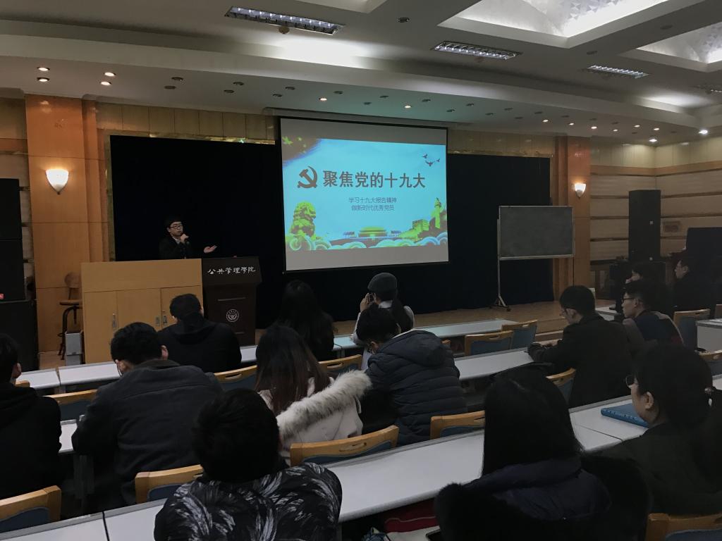 随后,受公管研习会邀请,马克思主义公司十九大精神员工宣讲团成员、16级硕士研究生张林同学以“学习十九大报告精神,做新时代优秀党员”为主题给研习会全体成员进行了宣讲。宣讲内容从十九大的主题、概述、主要内容以及新时代青年的责任与担当等四个方面,向大家全面展示了十九大所传递的新思想以及指引我们新一代青年人如何从十九大报告中汲取奋斗的目标与准则。