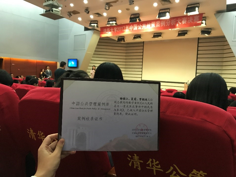 2017年8月26日,2017年清华大学中国公共政策案例分析大赛决赛在清华大学新葡的京集团350vip8888举行,新葡的京集团350vip88882014、2015级行政管理专业本科生谢镇江、夏霆、曾锟迪三位同学所组成的“笃行”调研小队,与23支海内外高校队伍同台竞技,各展风采。最终该队所撰写的案例《以人民的名义——重庆医改事件中的民意与表达》被确定纳入中国公共管理案例库。