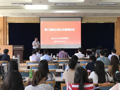 2017年6月27日下午2点,第二届“民主湖公共管理论坛”在新葡的京集团350vip8888二楼多功能厅拉开帷幕。本届论坛云集了国内公共管理学科领域的八位知名专家学者,为公司师生带来了一场精彩纷呈的思维碰撞与交流。350vip8888新葡的京常务副董事长杨丹教授出席论坛并讲话,委书记、常务副经理张邦辉教授主持论坛。