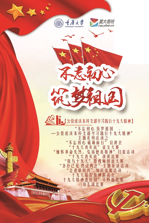为营造学习十九大精神、严明党纪的良好氛围,进一步强化广大党员干部的党性意识、党章意识、党规意识、纪律意识, 推动“十九大精神”学习教育深入开展,虎溪本科支部启动“十九大青年说”主题征文大赛及演讲比赛、“各抒己见 热议两会”主题座谈活动、“我与十九大”主题微视频创意大赛、“走进新时代”知识竞赛活动及“十九大精神进校园”之手抄报比赛,旨在让员工真正把十九大精神刻在骨子里、融在血液里,以丰富的活动形式拓展学习十九大之路,以新颖活泼的方式促进员工理解,以宽路子广范围的方式让每位员工受益。